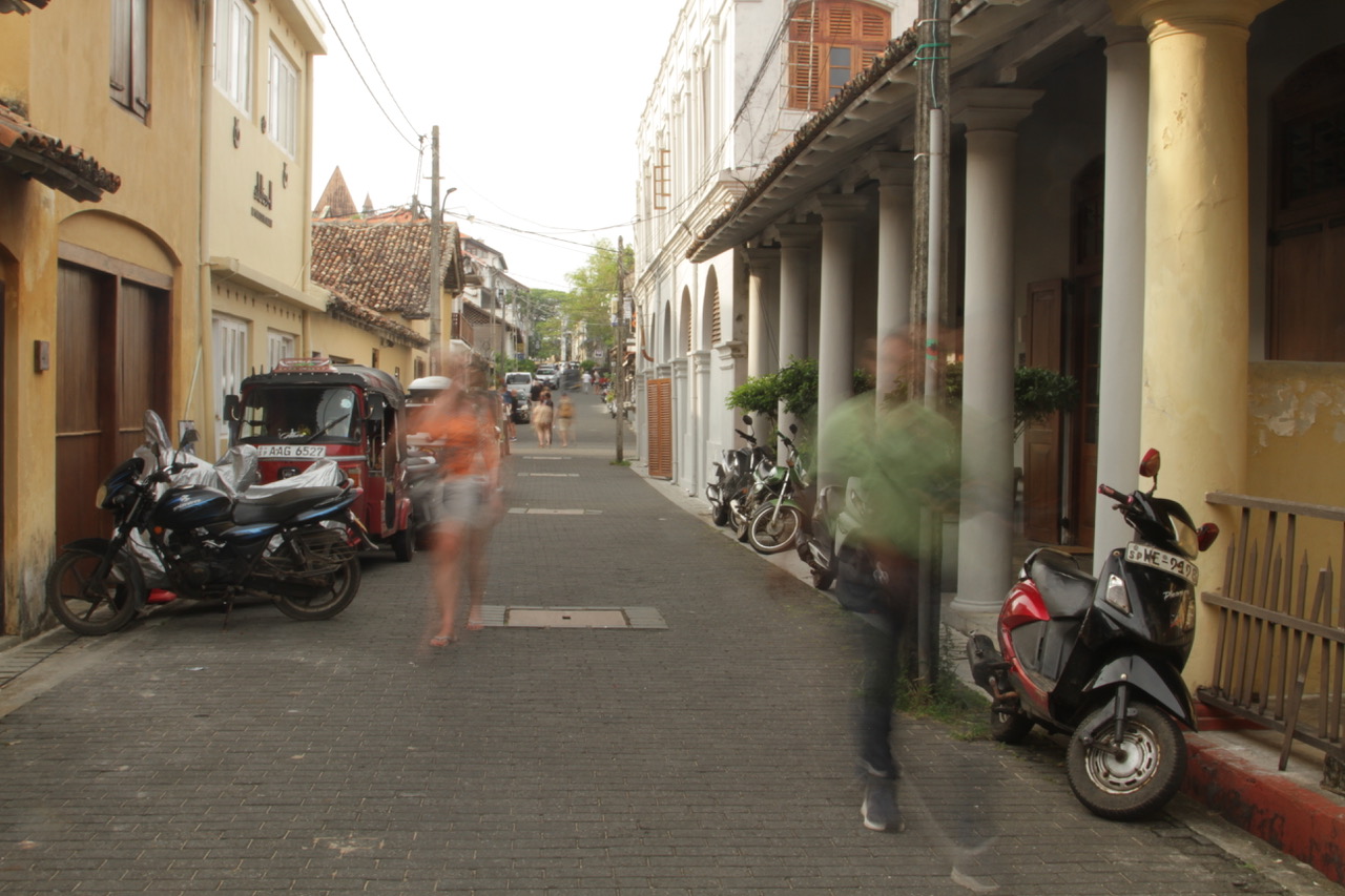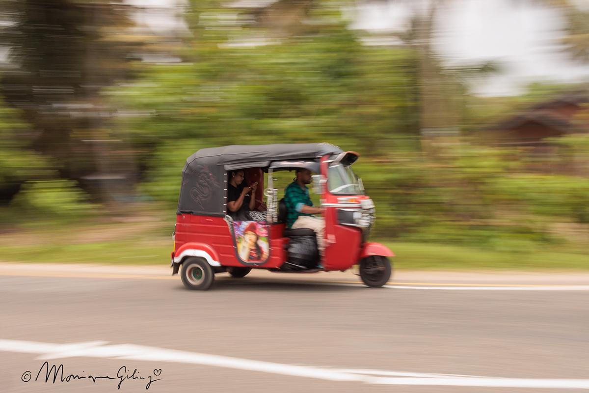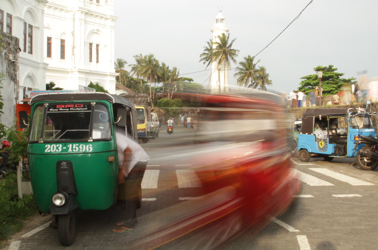 Het was heel fijn dat Monique letterlijk naast me kwam staan en me wees op dingen die ik zelf niet zag. Zoals bij de vismarkt, waar ik een man had gefotografeerd. Monique wees op zijn gele laarzen – een klein detail dat de compositie meteen sterker maakte. Dat soort aanwijzingen waren voor mij enorm leerzaam. Ook heb ik gewerkt met ND-filters en lange sluitertijden. Ik ben supertrots op mijn foto van de tuktuk in Galle!